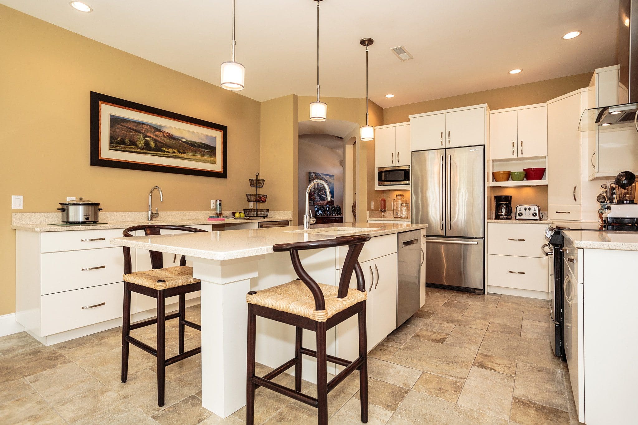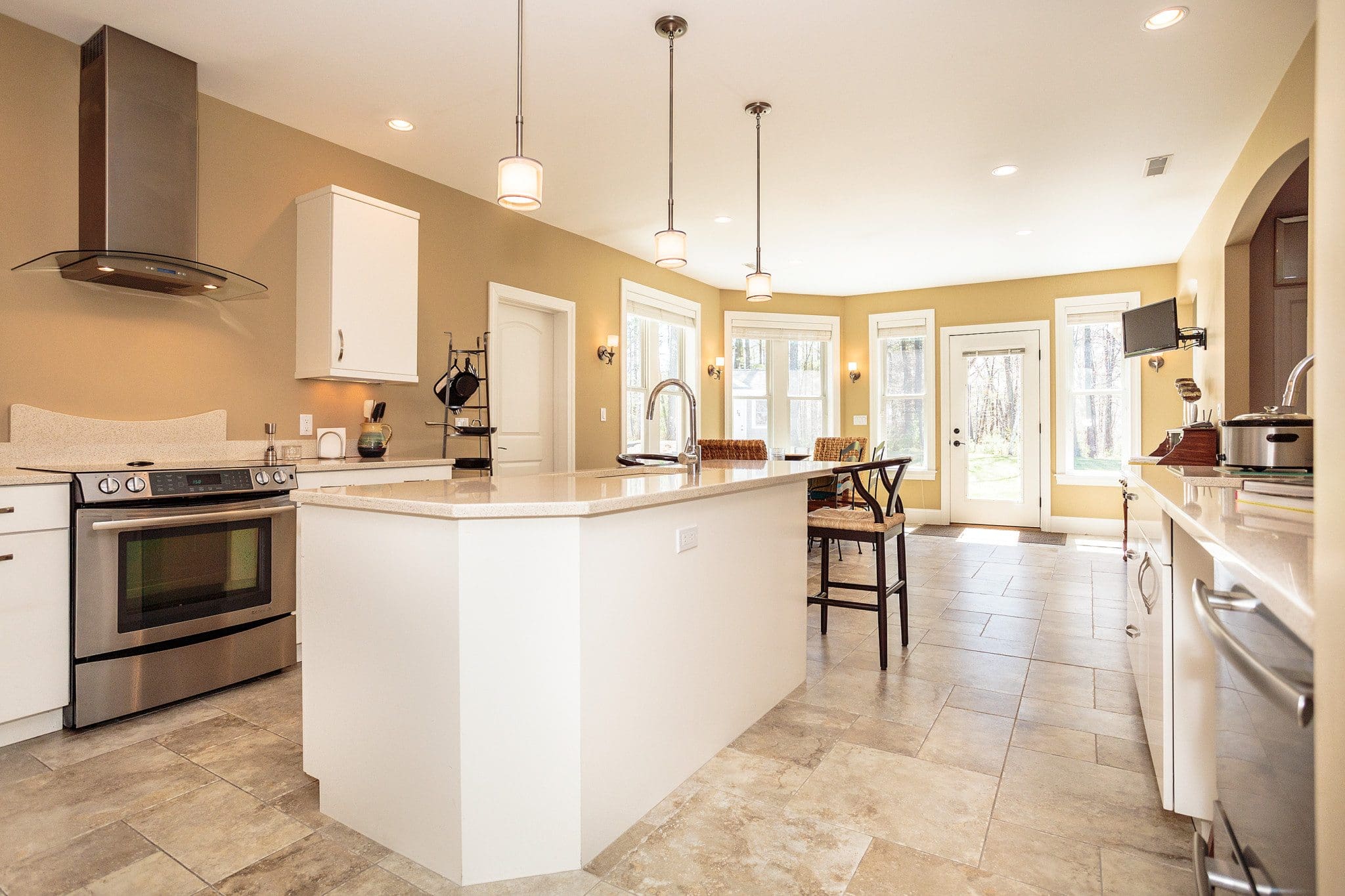 168 Catamount Road has a luxurious open floor plan that includes a kitchen, a dining area, a family room and a sunroom. A great home for entertaining and easy one level living! With a beautiful kitchen featuring granite, stainless steel appliances, a prep sink, a large walk-in pantry, an extra refrigerator, a center island with breakfast bar, a dining area, under mount lights and upgraded tile. Enjoy the bright sunroom with cathedral ceilings and a “North Star” cast iron insert with blower for ambiance and extra heat. Recessed lighting throughout the house.