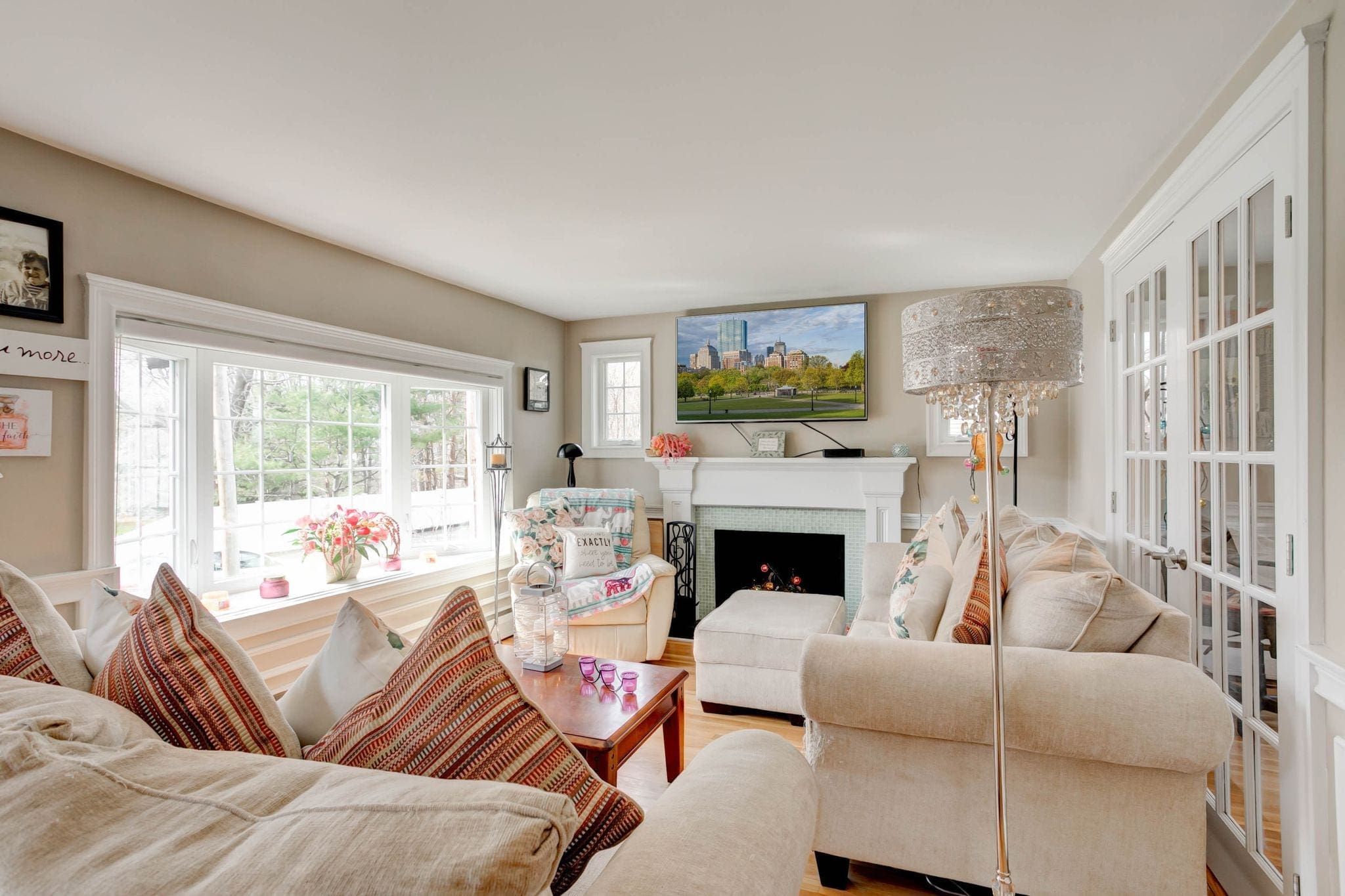 Bay windows, Custom built cabinets/closets, fireplace, French Doors, Hardwood Floor, Sunroom
