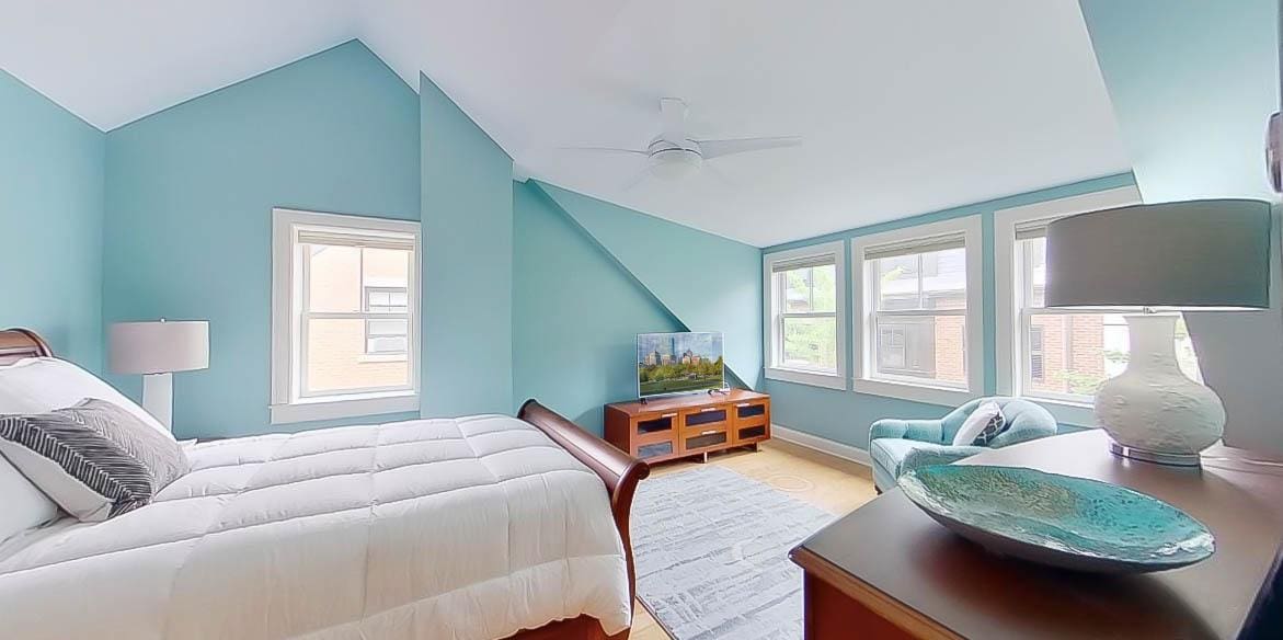 Third level features two generously proportioned guest bedrooms (which may be used as additional home office space) and a gorgeous upgraded full bath including custom cabinets with limestone countertops, limestone floor tiles, and high-end fixtures.