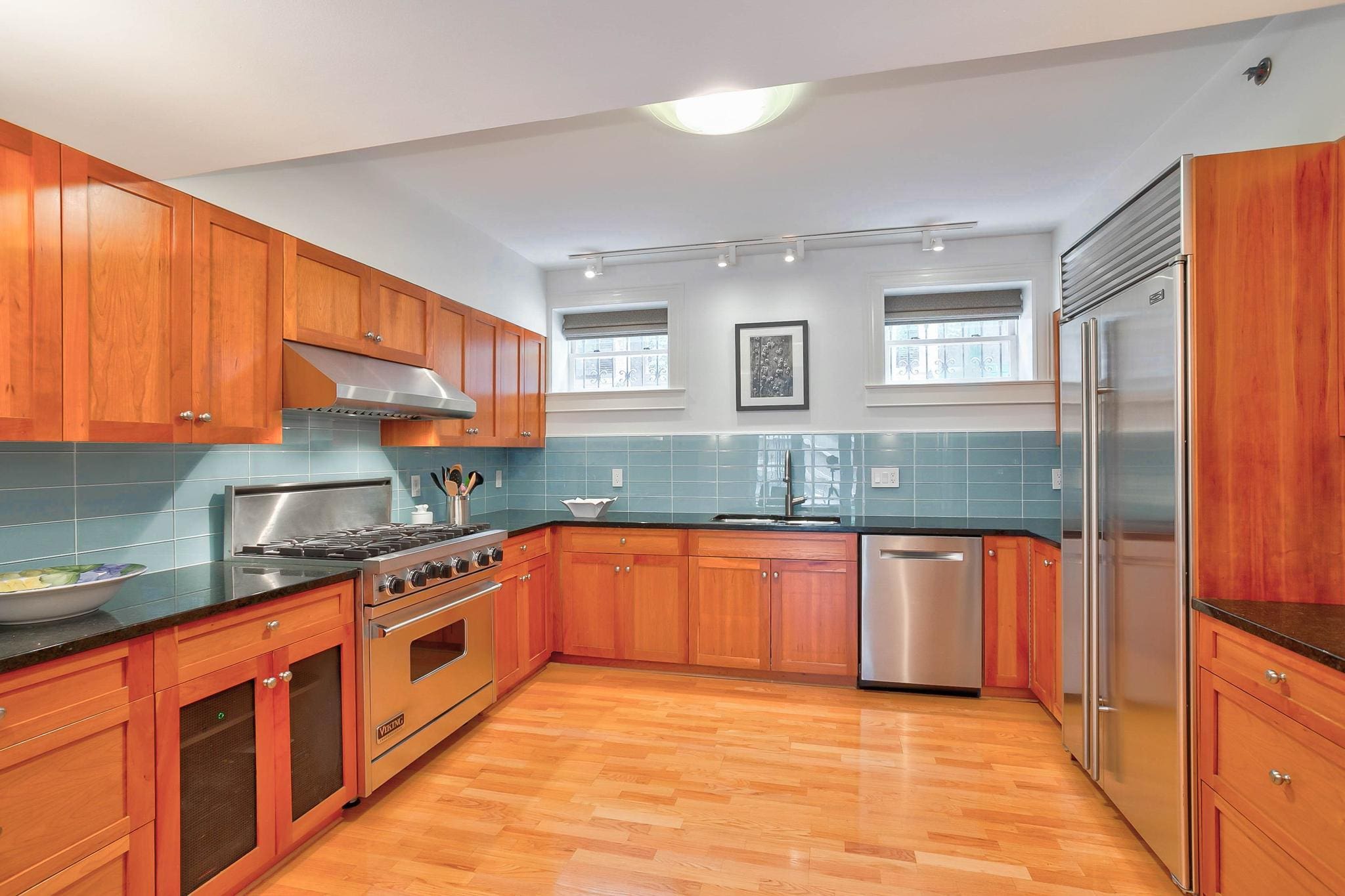 First level features a stunning oversized chef’s kitchen with granite countertops and subway tiles, stainless steel appliances (Viking Professional six burner stove with a high-end Broan range hood/exhaust fan, Bosch dishwasher, and Subzero refrigerator/freezer). An adjacent dining/family room features built-in shelving/cabinets and paneled glass door leading outside to a beautiful new professionally landscaped patio and fenced private terrace. This level also offers an upgraded powder room and laundry area.